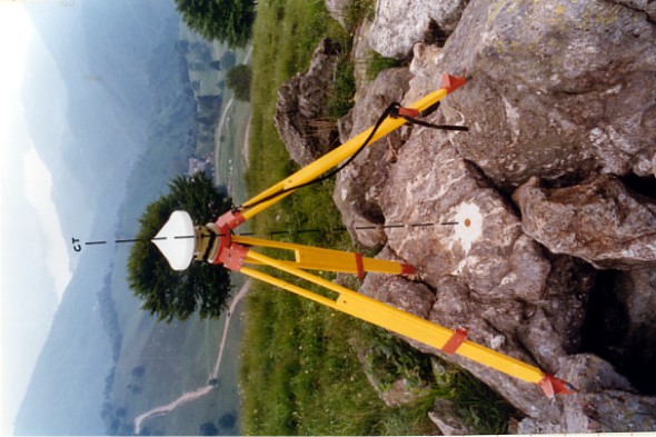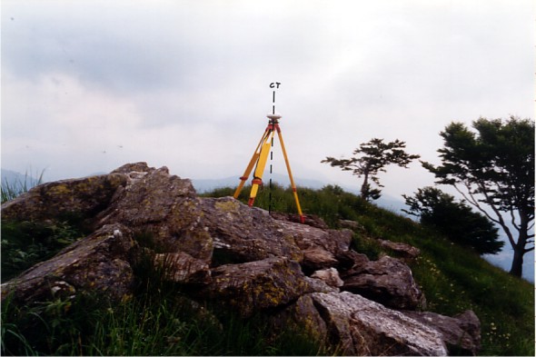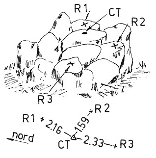 Sulla cima del monte Novesso. Centrino di fondo cementato su di un masso. Riferimenti: R1, R2, R3 croci incise su roccia. GPS