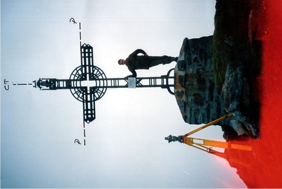 Segnale sulla cima rocciosa del monte. Croce in ferro posta su di un basamento in pietrame ben cementato. Asse geometrico della croce, denominata Croce di Neve.