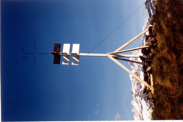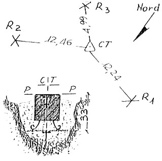 Centrino di superficie in blocchetto di calcestruzzo prefabbricato con sottostante centrino di fondo coassiale cementati in blocchi separati di calcestruzzo. Riferimenti R1, R2, R3 croci incise su roccia.