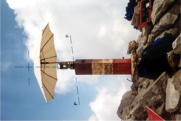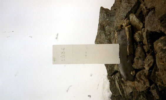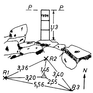 Sulla cima più alta del monte; pilastrino Trombetti. Riferimenti: R1, R2, R3 croci incise su roccia.