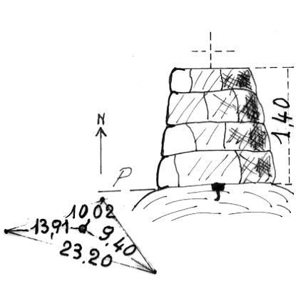 Segnale sulla cima del monte. Centrino di zinco cementato nel suolo, coassiale pilastrino di pietrame a secco. Riferimenti come da pianta.