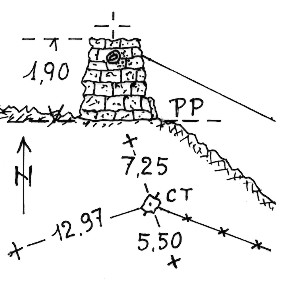 | Materializzazione | Segnale sul costone che dalla Testa dei Rossi scende a Montescheno. Pilastro squadrato di pietre a secco sostegno di una teleferica alpigiana che scende tra le Alpi di Fayo. Riferimenti: tre croci incise su pietra. |