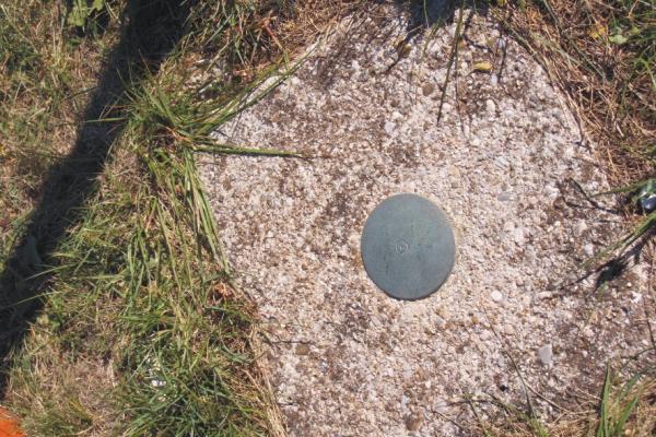 Contrassegno anonimo in bronzo con foro centrale infisso in un blocco di cemento nel prato alle spalle delle costruzioni situate a destra del viale di accesso all' Osservatorio Nazionale di Geofisica.