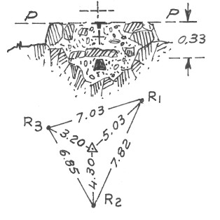 Segnale sulla sommità di un colle sassoso a Nord di Monrupino. Centrino di fondo e di superficie, quest'ultimo mancante della parte superiore. Riferimenti: tre segni con minio; R1 e R3 su pietre di un muretto; R2 su roccia affiorante.