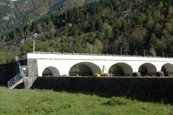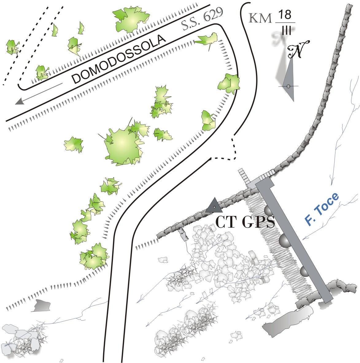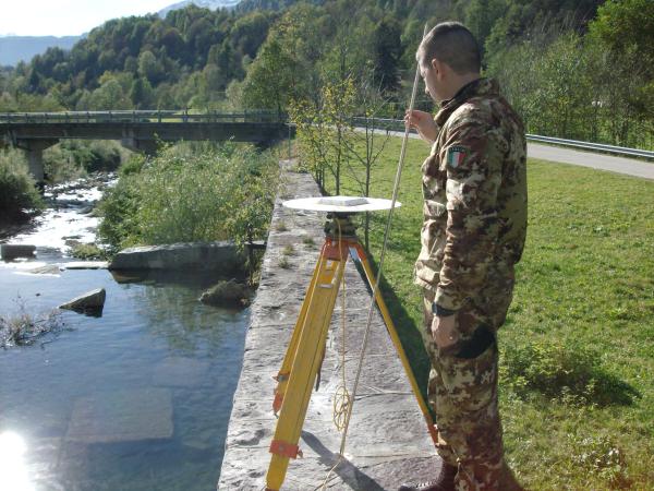 Centrino universale IGM infisso sull'argine destro in pietra del fiume Toce a valle dello sbarramento situato all'altezza dell'abitato di Piedilago.