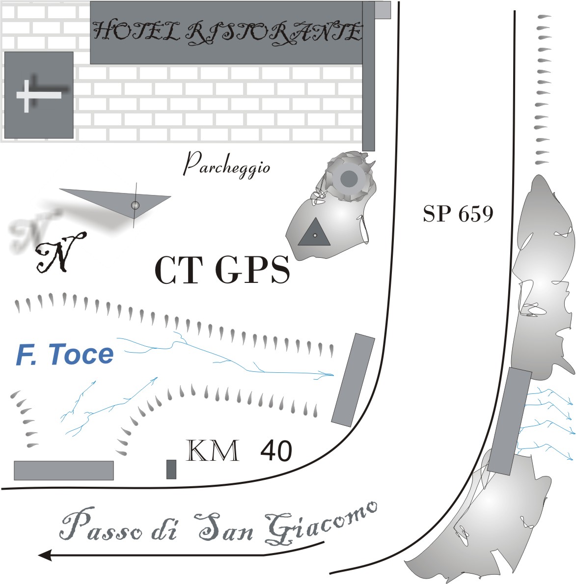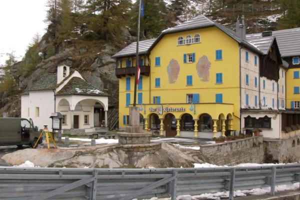| materializzazione | Centrino metallico della Regione Piemonte infisso nella roccia di fondazione del pilone portabandiera posto nel piazzale antistante l'albergo a ridosso della strada S.S. 659. |