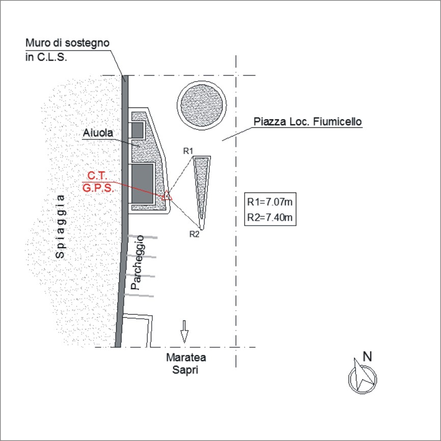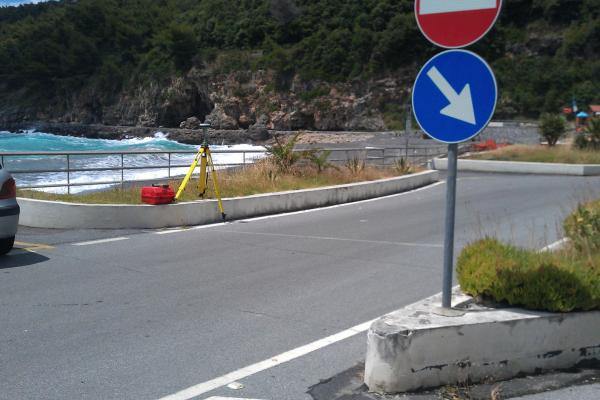 Centrino metallico orizzontale di tipo chiodo con rondella ARPAB Regione Basilicata infisso sulla sommità di un cordolo della aiuola stradale nella piazzetta affacciata sul mare, in località Fiumicello.