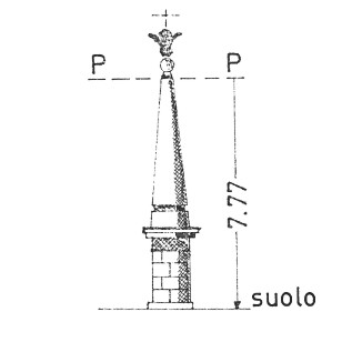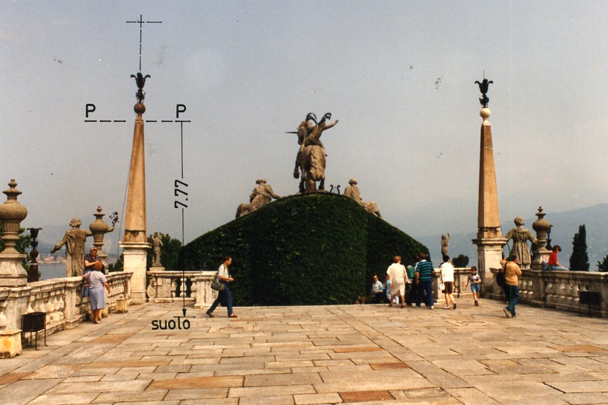 Asse dell' obelisco all' angolo Nord-Ovest del terrazzo superiore della Villa Borromeo posta nella parte Sud dell' isola.