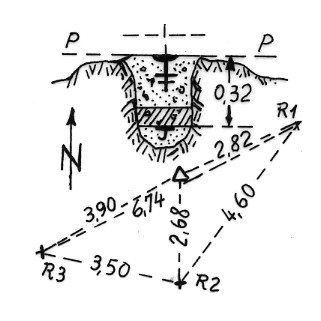 | Materializzazione | Segnale sulla sommità della collina omonima. Centrino di fondo e di superficie in una spaccatura di roccia affiorante. Riferimenti: Tre croci incise e miniate. |
