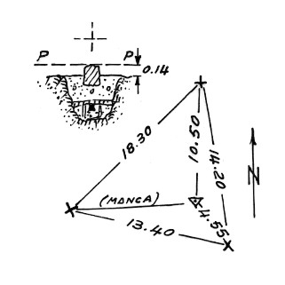 | Materializzazione | Segnale sul monte. Centrino di fondo metallico con sovrastante pilastrino di pietra affiorante dal suolo e croce incisa alla sommità. Riferimenti: croci incise su rocce affioranti. |