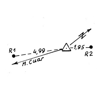 Segnale sulla cima del monte. Centrino di superficie cementato su di un grosso masso. Riferimenti: due centrini metallici cementati su spuntoni di roccia (R1, R2).