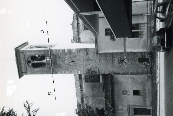Campanile della chiesa parrocchiale. Asse geometrico del campanile. Sul pavimento della cella campanaria in corrispondenza dell'asse del campanile è stato verniciato in rosso un triangolo con un foro al centro.