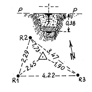 Segnale sulla sommità del colle prativo immediatamente a Nord di uno scavo quadrato. Centrini di fondo e di superficie. Riferimenti: tre centrini metallici.