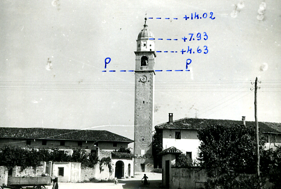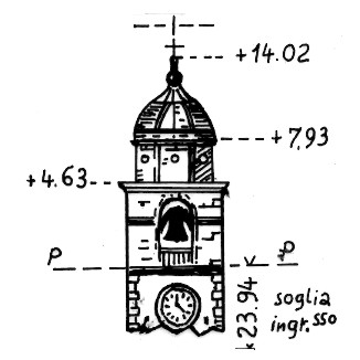 | Materializzazione | Campanile della chiesa parrocchiale. Asse geometrico del campanile materializzato sul pavimento della cella campanaria da un triangolo bianco con un foro al centro. |