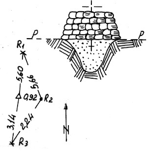 | Materializzazione | Segnale sul monte a Sud di Claut. Centrino di superficie cementato tra le pietre e sormontato da una piramide di sassi a secco. Riferimenti: R1 e R3 croci miniate su rocce affioranti; R2 centrino metallico. |