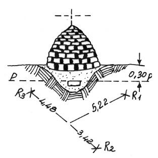 | Materializzazione | Segnale su di un acrocoro ad Est di Lesis. Triangolo inciso su pietra interrata e sormontata da una piramide di pietre. Riferimenti: tre centrini su rocce affioranti. |