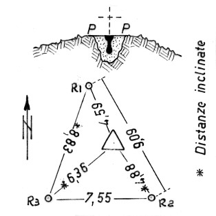 Segnale sulla cima del monte. Centrino di vetro cementato nella roccia. Riferimenti: Tre centrini metallici.