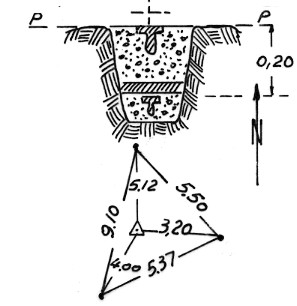 | Materializzazione | Segnale sullo sperone roccioso di calcare grigio scuro sul monte omonimo. Centrini di superficie in vetro bianco e di fondo in vetro nero. Riferimenti: 3 in vetro nero. |