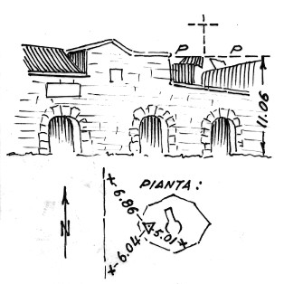 Segnale su di una piazzola, la più alta e più a Sud, sulla sommità dell'edificio già adibito a forte. Centrino di superficie. Riferimenti: tre croci incise sulla piazzola.