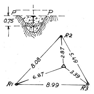 Segnale sulla parte più alta del monte ricoperto di vegetazione. Centrini di profondità e di superficie. Rif.: Tre centrini.