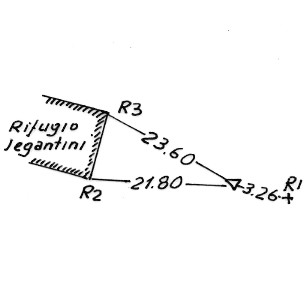 Segnale sopra un grosso masso ad Ovest del Rifugio omonimo. Croce incisa. Riferimenti: croce incisa (R1), spigoli del rifugio (R2,R3).