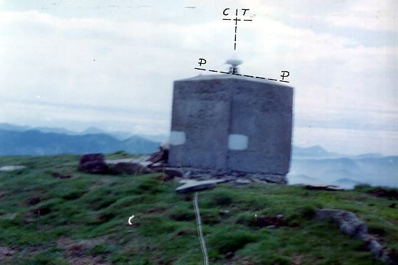 | Materializzazione | Segnale sulla cima del monte omonimo. Blocco di calcestruzzo recante sulla sommità centrino cementato di fondo. |
