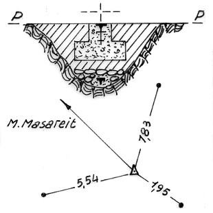 Segnale sulla cima del monte a N. E. di Dordolla. Centrini di fondo e superficie in blocco di calcestruzzo. Riferimenti: 3 centrini come da pianta.