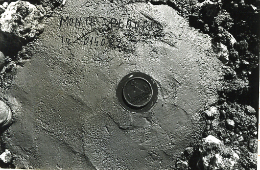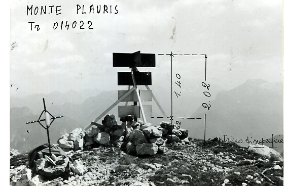 Segnale sulla cima del monte omonimo. Centrini di superficie e di fondo cementati in blocchi di calcestruzzo. Riferimenti: R1, R2, R3 centrini su roccia; R4 piccola croce in ferro.