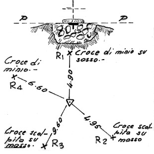 | Materializzazione | Segnale sulla sommità del monte. Centrino di superficie cementato su sassi e coperto da una pietra con croce scolpita e miniata. Riferimenti: come da pianta. |