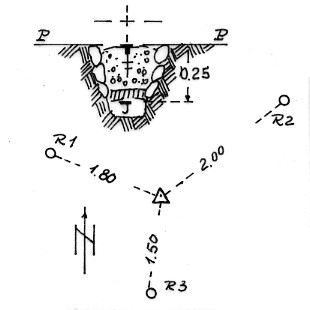 Segnale sulla sommità del monte. Centrino di fondo cementato alla roccia e sovrastante centrino di superficie in blocco di calcestruzzo. Riferimenti: 3 centrini metallici.