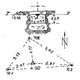 | Materializzazione | Segnale sul monte. Pietra interrata con triangolo inciso e miniato e sovrastante centrino di superficie e coassiale, ed affiorante, pietra con triangolo inciso e miniato. Riferimenti: R1centrino; R2 croce incisa su cemento; R3 croce incisa su roccia. |