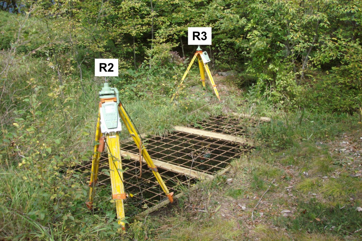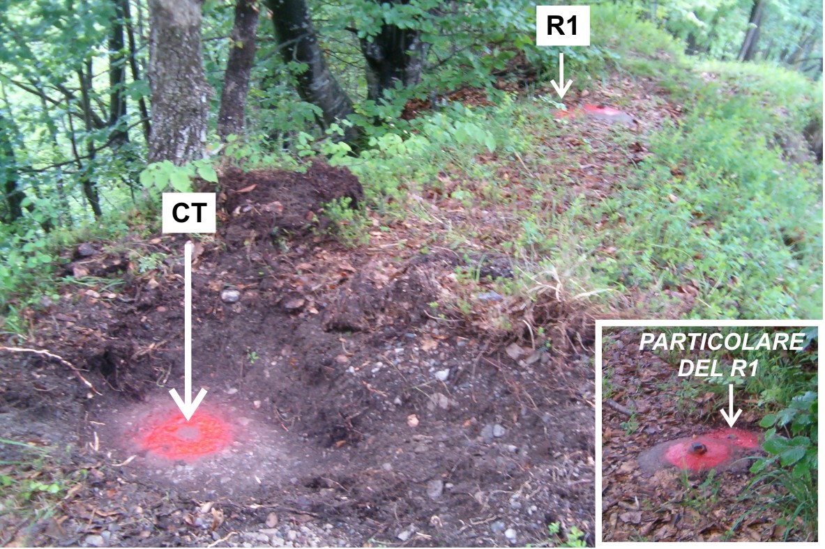 Segnale sul punto più alto del monte. Centrino di fondo in blocco di calcestruzzo. Riferimenti: R1, centrino di riferimento; R2 associato GPS; R3 centrino GPS C. Coordinate dei riferimenti: R2: N= 5 139 784,115 E= 2 353 092,491 R3: N= 5 139 789,419 E= 2 353 090,993