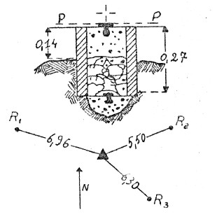 Segnale sulla cima del monte. Centrini di fondo e di superficie in vetro. Riferimenti: 2 centrini metallici R1, R2 e una in vetro R3 .