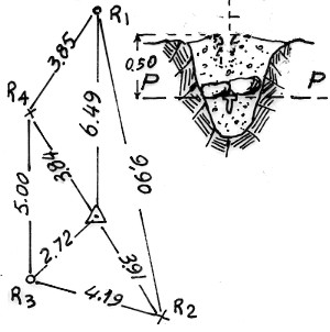 | Materializzazione | Segnale sulla cima sassosa. Resti centrino di fondo in vetro protetti. Riferimenti: R1, R3 centrini in vetro; R2, R4 croci incise su roccie. |