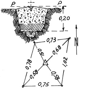 | Materializzazione | Segnale sula parte più elevata del monte. Centrini di vetro bianco in superficiee di vetro nero di fondo. Riferimenti; 4 centrini di vetro nero cementati al suolo. |