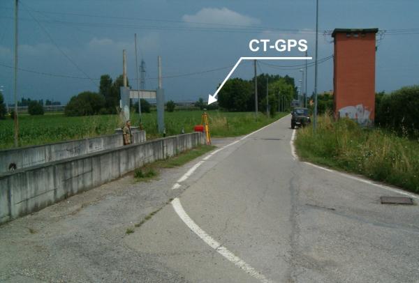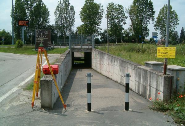 Centrino in acciaio inox del tipo "GPS" da livellazione, infisso sull'estremità del muretto del sottopasso pedonale della nuova S.S.9.