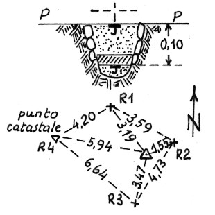 | Materializzazione | Segnale all'estremità meridionale della vetta. Centrino di fondo coassiale ad altro centrino di fondo cementato in superficie. Riferimenti: 3 croci incise su roccia, tinteggiate in rosso e con la scritta: I. G. M. 1- I. G. M. 2 – I. G. M. 3 (R1, R2, R3); un triangolo scolpito su roccia (catastale) R4. |