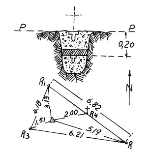 Segnale in prossimità di una croce votiva, sul più alto dei cocuzzoli del monte omonimo. Centrini di superficie e di fondo in vetro. Riferimenti: R1, R2, R3, centrini di vetro, R4 croce votiva.