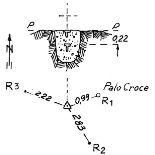 | Materializzazione | Segnale sull'estremità Nord di uno sperone roccioso ad Ovest di Cibiana. Centrini di superficie e di fondo in vetro. Riferimenti: come da pianta. |