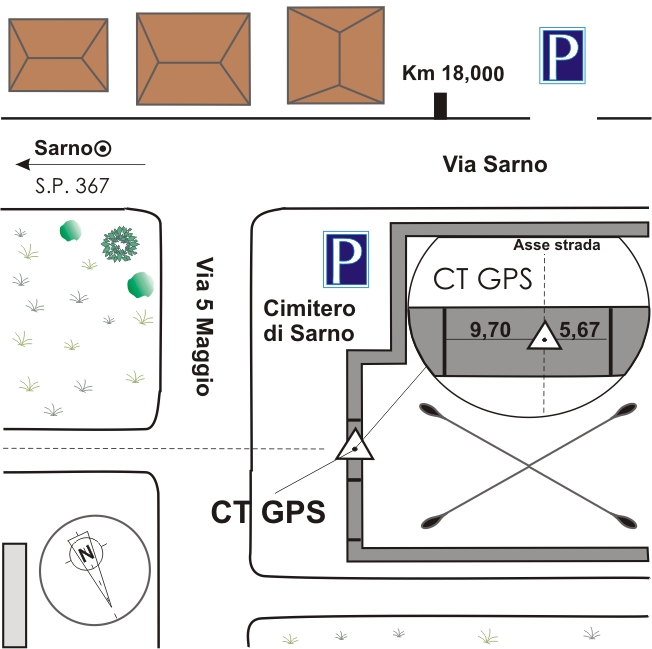 | materializzazione | Centrino di tipo "GPS C" infisso al centro della sommità del muro perimetrale del cimitero di Sarno, lato prospicente via 5 Maggio, in corrispondenza dell'asse della prima strada a destra; a 5,67 metri dal gradone più alto formato dal muro stesso ed a 9,70 metri dal gradone del muro più basso. |