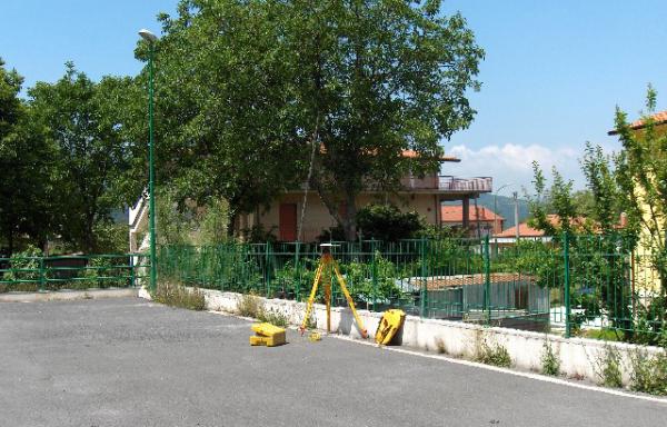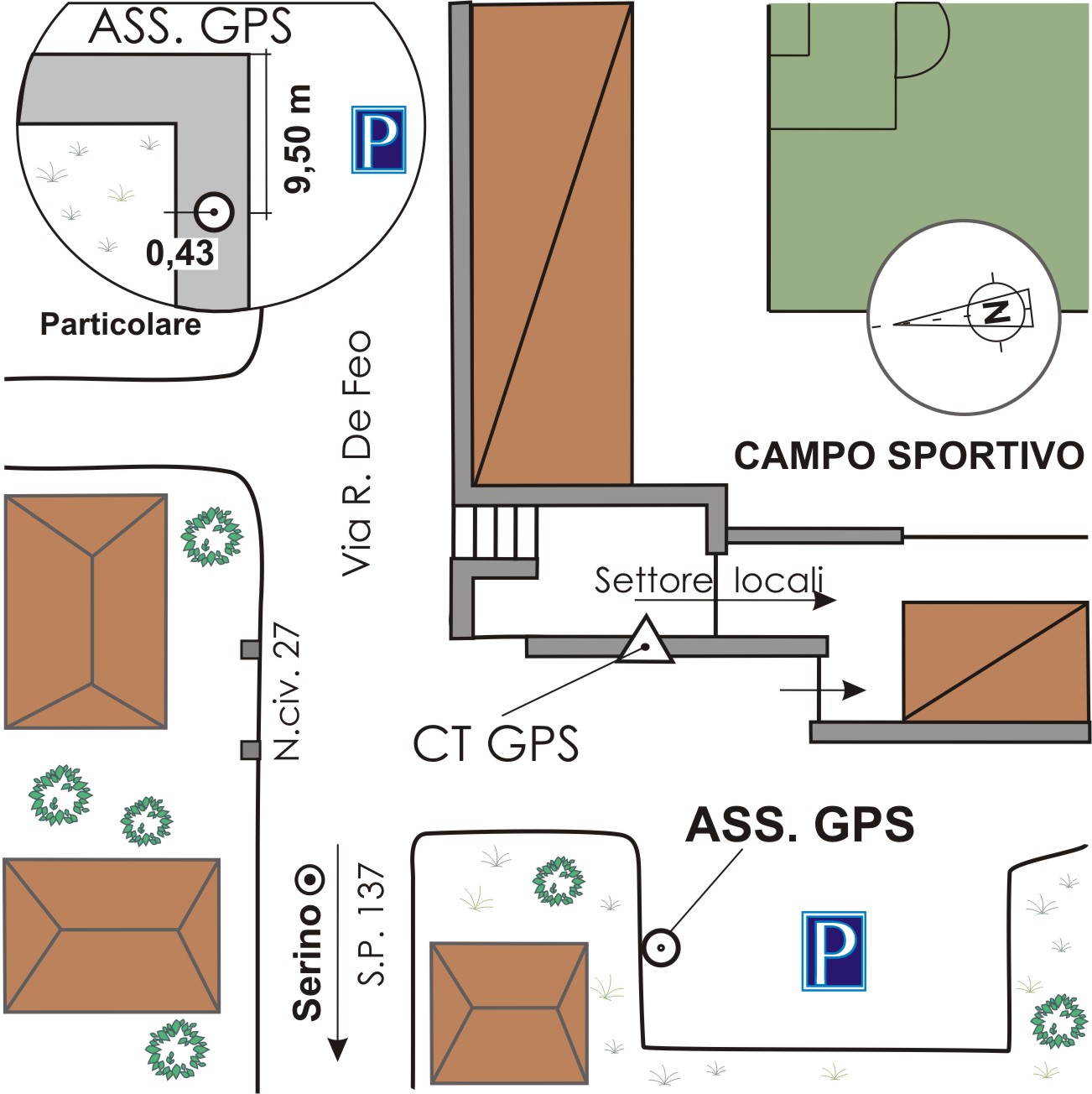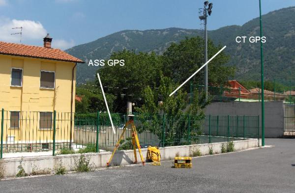 | materializzazione | Centrino di tipo "GPS D" infisso nella soletta in cemento, lato nord, che delimita il parcheggio adiacente il campo sportivo, a circa 9,50 metri dallo spigolo formato dalla strada di accesso con il piazzale. |
