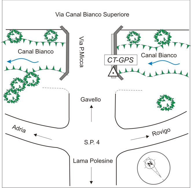 | materializzazione | Centrino in acciaio inox, di altro Ente, del tipo "GPS" da livellazione con denominazione AB-FTC n°110, infisso sul marciapiede del ponte sul Canal Bianco, a destra in direzione Gavello. |