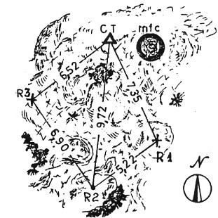 Asse geometrico del basamento troncoconico in pietre murate del monumento a San Michele . Riferimenti: R1 e R3 croci incise, R2 centrino inox recante la scritta IGM CT GPS.