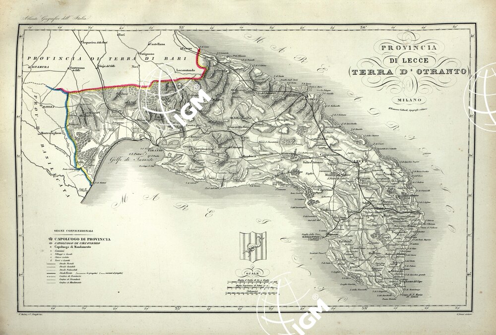 ATLANTE ORO-IDROGRAFICO COROGRAFICO E STORICO DELL’ ITALIA ANNI dal 1138 a dopo il 1870 – PROVINCIA DI LECCE – TERRA D’ OTRANTO