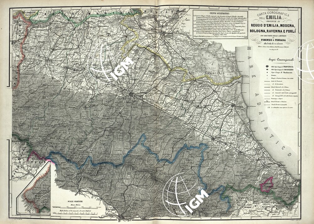 ATLANTE ORO-IDROGRAFICO COROGRAFICO E STORICO DELL’ ITALIA ANNI dal 1138 a dopo il 1870 – CARTA COROGRAFICA DELL’ EMILIA CON LE PROVINCIE DI REGGIO EMILIA, MODENA, BOLOGNA, RAVENNA E FORLÌ