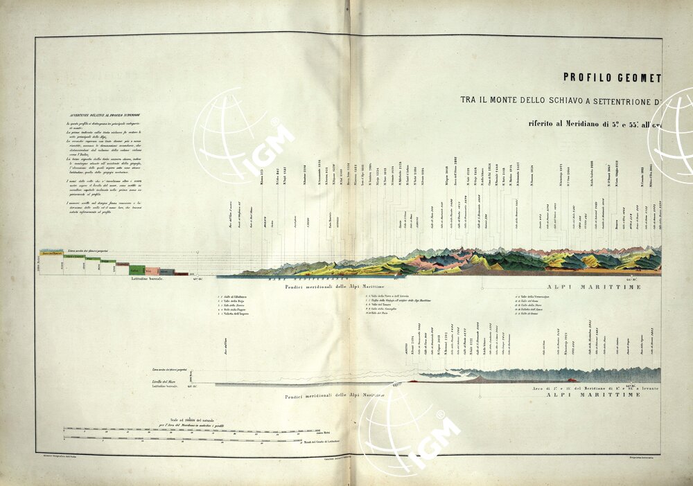 ATLANTE ORO-IDROGRAFICO COROGRAFICO E STORICO DELL’ ITALIA ANNI dal 1138 a dopo il 1870 – PROFILO GEOMETRICO DELLE ALPI TRA IL MONTE SCHIAVO A SETTENTRIONE D’ ALBENGA SUL MEDITERRANEO E IL MONTE BIANCO PARTE 1