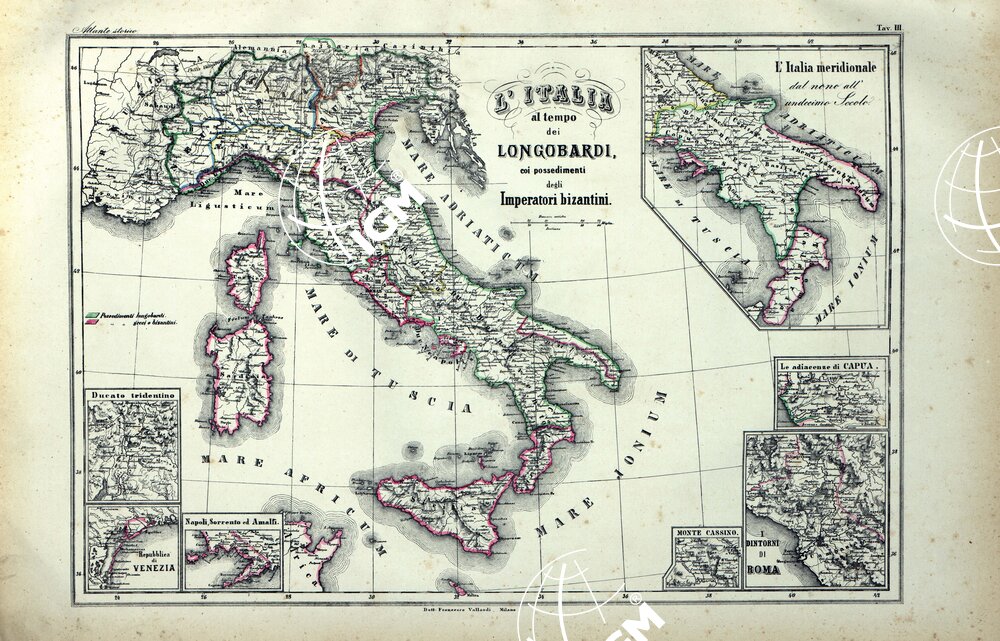 ATLANTE ORO-IDROGRAFICO COROGRAFICO E STORICO DELL’ ITALIA ANNI dal 1138 a dopo il 1870 – L’ ITALIA AL TEMPO DEI LONGOBARDI COI POSSEDIMENTI DEGLI IMPERATORI BIZANTINI TAVOLA III