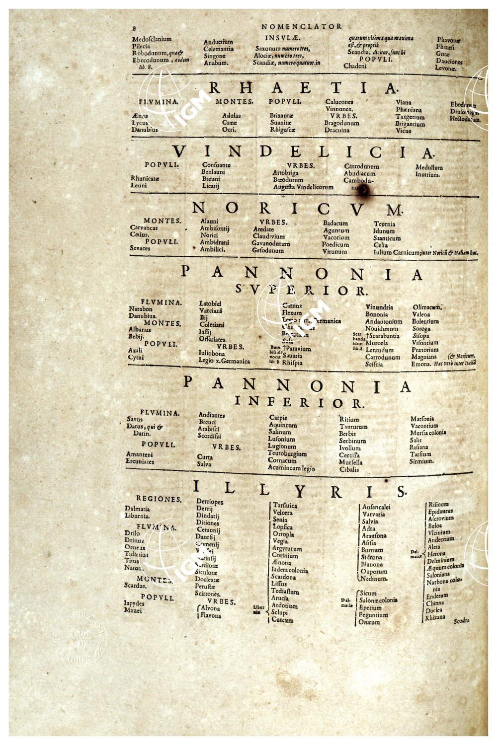 THEATRUM ORBIS TERRARUM (ATLANTE DELL’ ORTELIO) A COLORI – GERMANIA, PANNONIA INFERIOR, PANNONIA SUPERIOR, RHAETIA, VINDELICIA, NORICUM, ILLYRIS INDICE