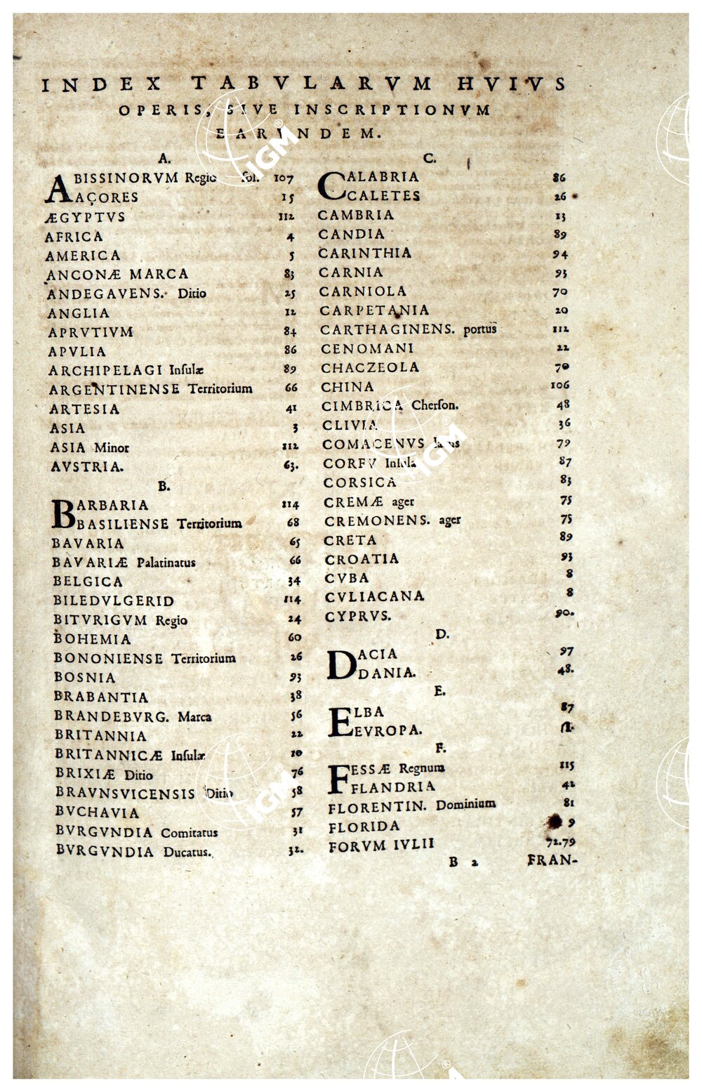 THEATRUM ORBIS TERRARUM (ATLANTE DELL’ ORTELIO) A COLORI – INDEX TABULARUM A – F