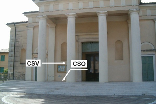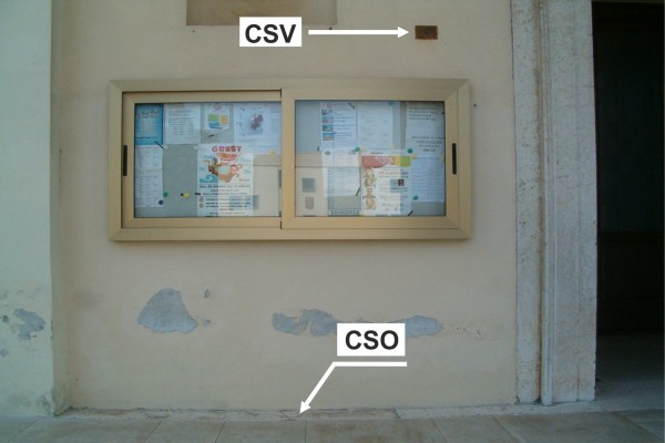 [{"simbolo_contrassegno":"B3","materializzazione":"(CSO) – Cerchio inciso sullo zoccolo alla base della facciata, sotto una nicchia dell'atrio, a sinistra della porta d'ingresso alla chiesa."},{"simbolo_contrassegno":"V3","materializzazione":"(CSV) – Piastrina antica IGM infissa sulla facciata suddetta, in corrispondenza del CSO."}]